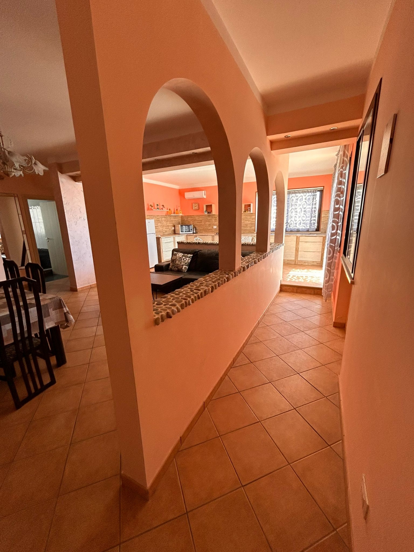 Ingresso su cucina-soggiorno-pranzo con angolo living, disimpegno, camera da letto, bagno, camera da letto matrimoniale oltre balcone angolare.