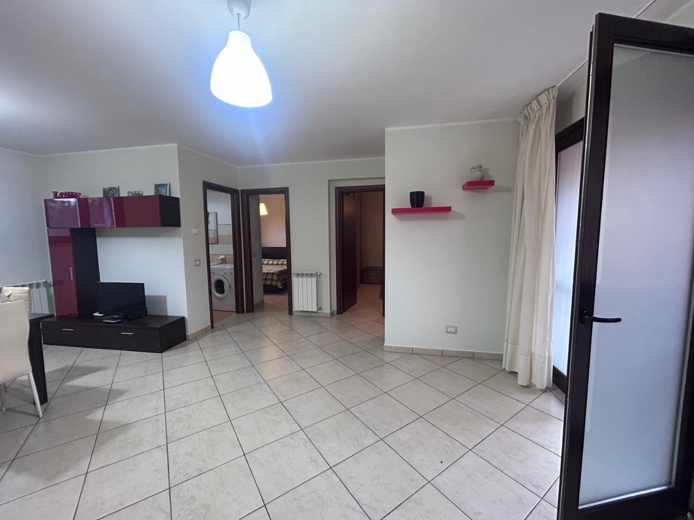 Ingresso su cucina-soggiorno-pranzo con zona living, disimpegno, ripostiglio-lavanderia, camera da letto matrimoniale, camera da letto e bagno-lavanderia.